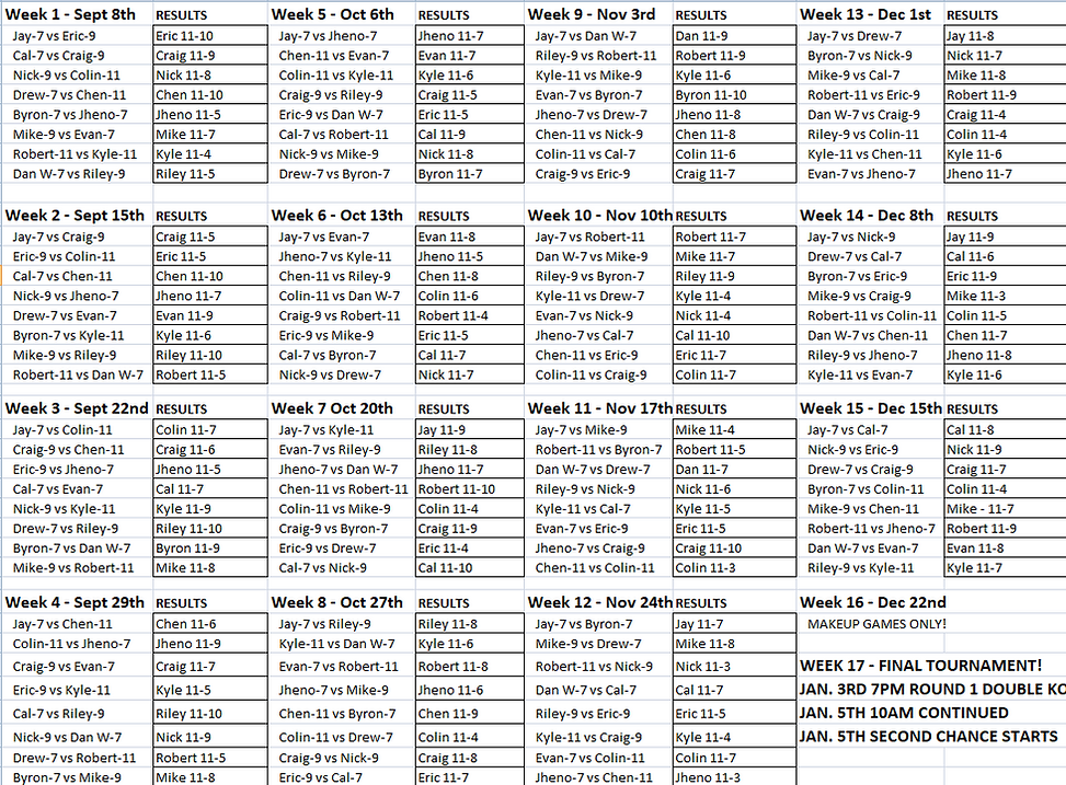 Top 8 in Standings after Round Robin play will advance to a double-KO final tournament held on Friday, January 3rd at 7PM for 1st round, play will continue - Sunday, January 5th, 2025 at 10am